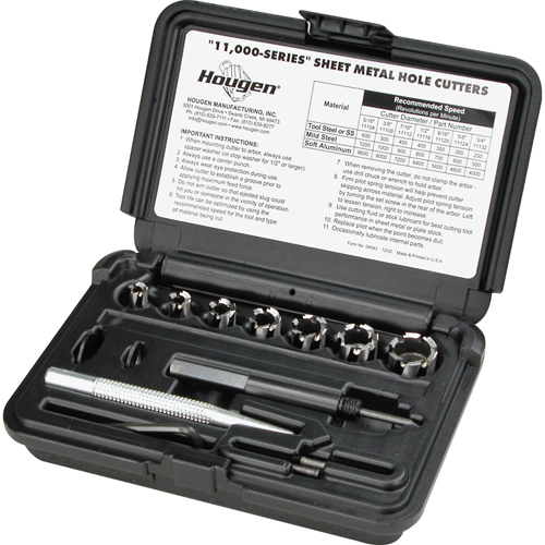 Plastic tool case contains 11088 Arbor Assembly, Center Punch, extra Pilot, and (7) Cutters (5/16, 3/8, 7/16, 1/2, 9/16, 5/8 & 3/4″)